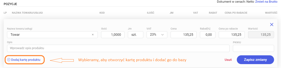 Po uzupełnieniu nazwy produktu, możemy go dodać na fakturę klikając w przycisk Dodaj. Jeśli chcemy dodatkowo zapisać go naszej bazie produktów, zaznaczamy parametr Dodaj kartę produktu. Po zapisie w programie tworzona jest karta produktu.