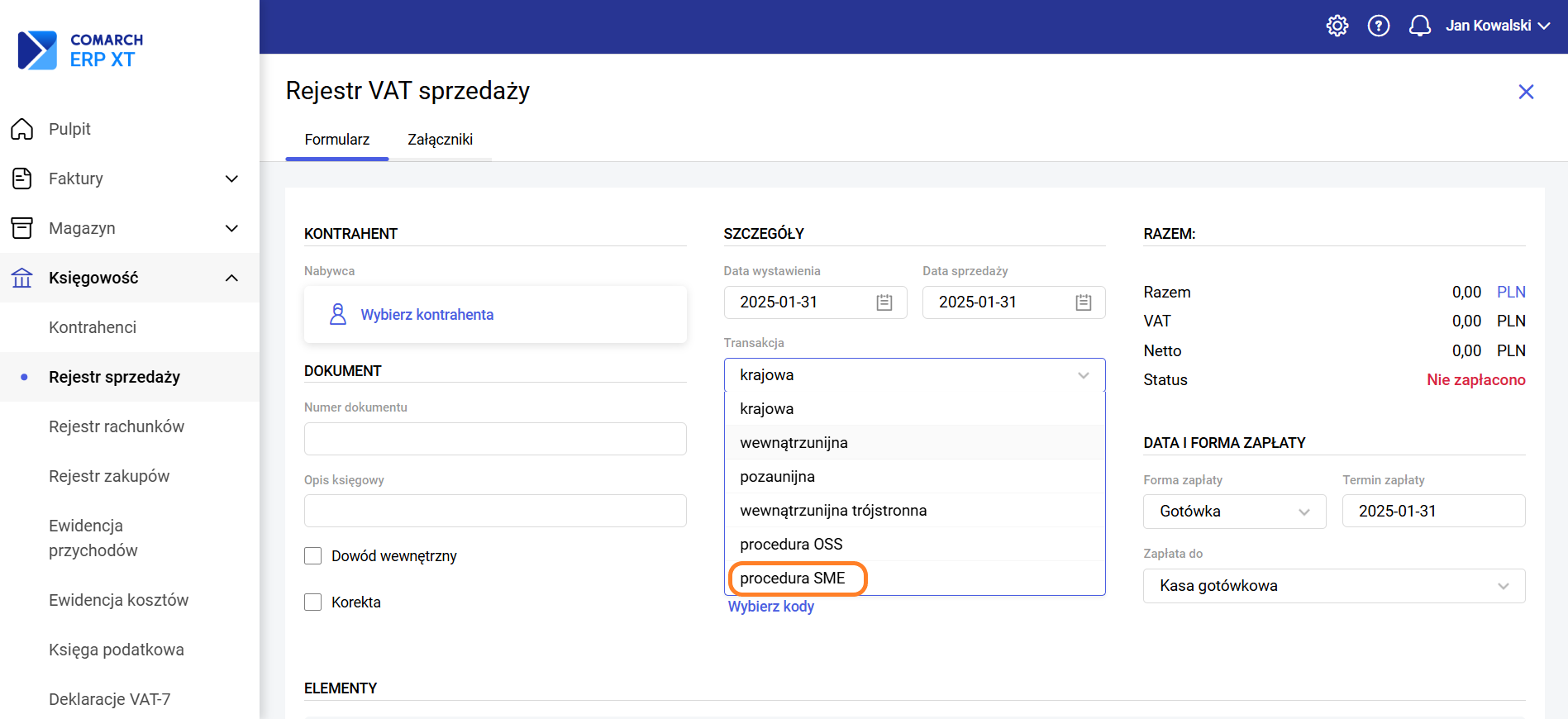 Na formularzu dokumentu należy wybrać kontrahenta unijnego, a następnie w polu Transakcja wskazać „procedura SME”.