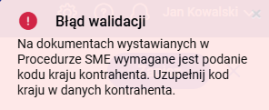 W sytuacji kiedy na dokumencie sprzedaży z wybranym rodzajem transakcji „procedura SME” został wskazany podmiot „osoba fizyczna”, podczas zapisywania takiego dokumentu jest sprawdzane, czy dla takiego kontrahenta został ustawiony prefiks kraju. W przypadku braku kodu kraju, system wyświetli właściwy komunikat.