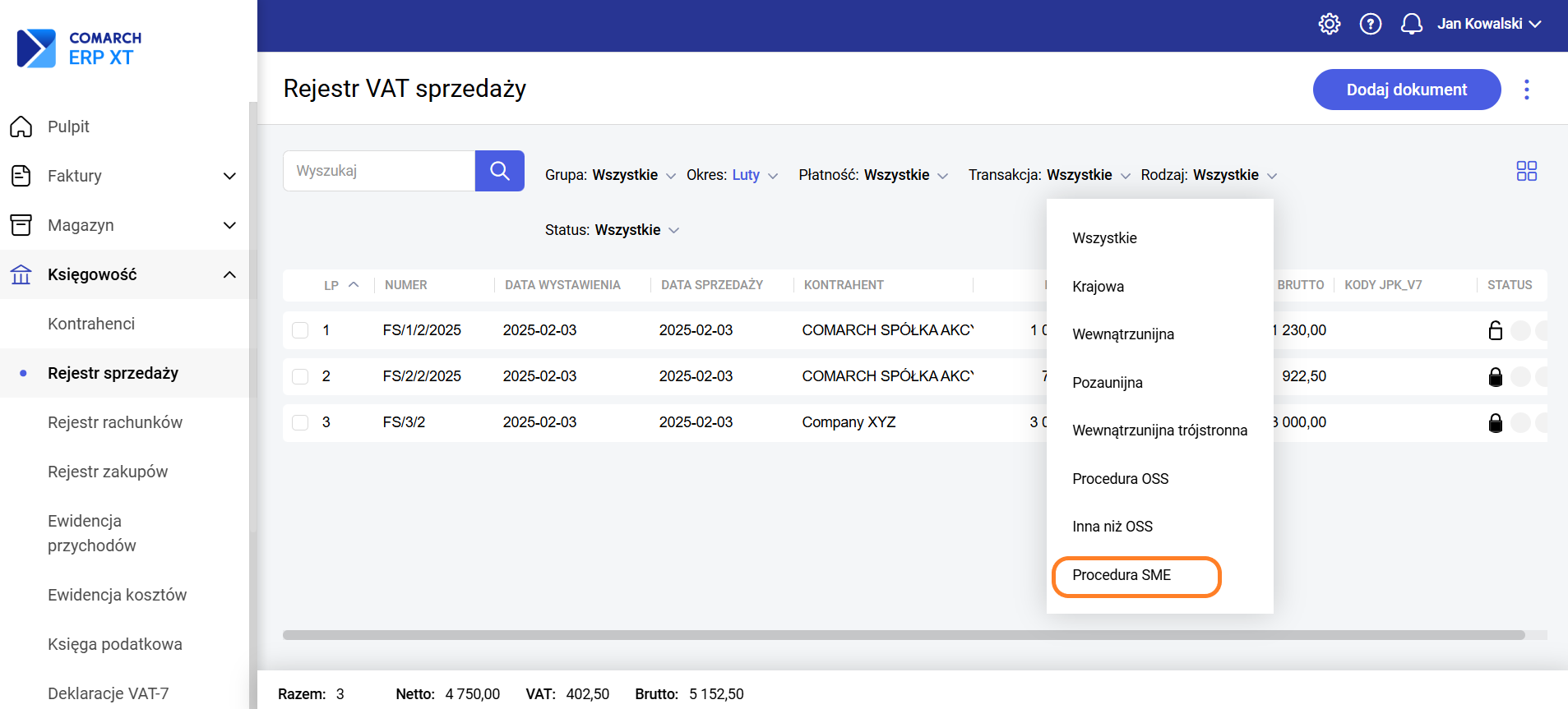 Na liście dokumentów w Rejestrze sprzedaży VAT jest możliwość wyfiltrowania transakcji oznaczonych jako Procedura SME.