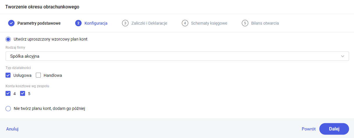 Jeżeli nie tworzymy planu kont (opcja „Nie twórz planu kont, dodam go później”) wtedy nie pojawi się etap 3. Zaliczki i deklaracje PIT oraz nastąpi przejście do etapu 4. Schematy księgowe.