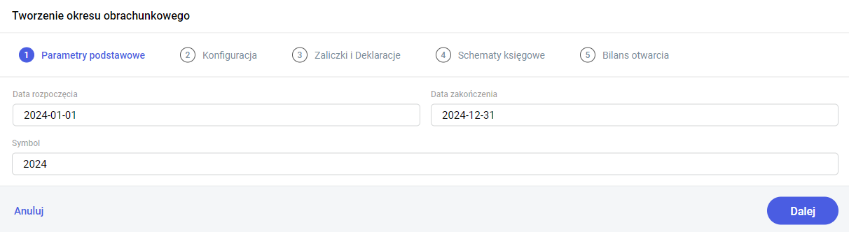 - etap 1 – należy podać parametry podstawowe okresu obrachunkowego takie jak daty rozpoczęcia i zakończenia oraz symbol lub potwierdzić zaproponowane przez system klikając przycisk „Dalej”