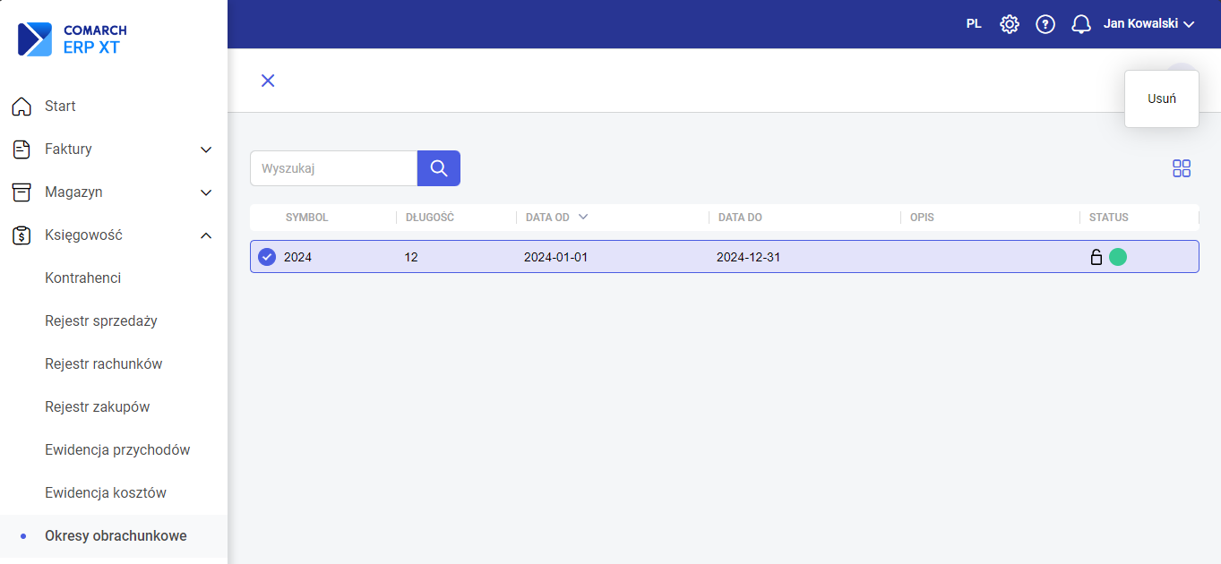 Usuwanie otwartego okresu obrachunkowego, do którego nie dodano dokumentów (bilans otwarcia, zapisy księgowe), możliwe jest z poziomu menu kontekstowego. Wraz z okresem obrachunkowym usuwany jest plan kont oraz dzienniki.