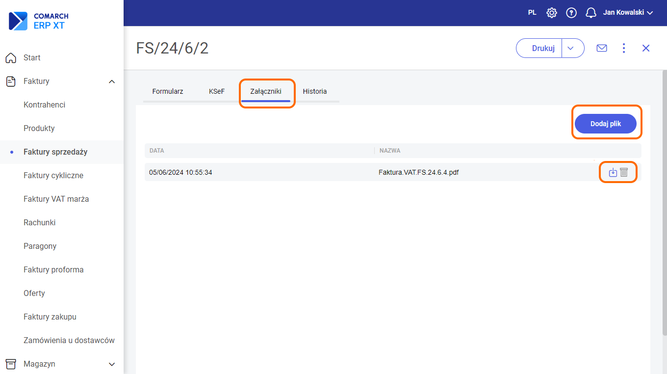 Użytkownik może tam dodawać oraz usuwać podpięte pod dany dokument pliki. Maksymalna wielkość jednego pliku to 2MB. Opcja dodawania nowych plików jest dostępna także dla dokumentów zatwierdzonych i anulowanych.