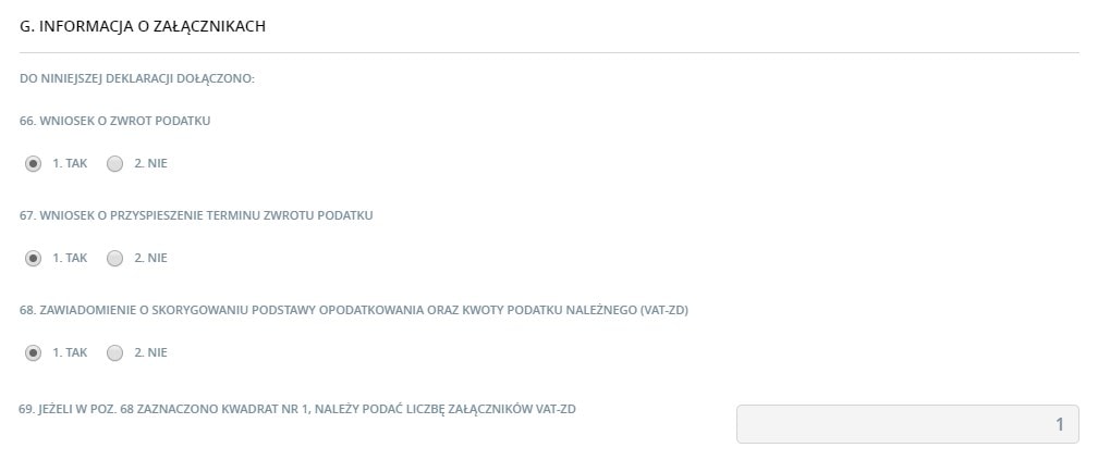 Do deklaracji VAT-7 istnieje możliwość dodania formularzy: VAT-ZZ, VAT-ZT, VAT-ZD, po zaznaczeniu odpowiednich pól w sekcji G. W programie można dodać załącznik w odpowiednim polu, wybierając opcję TAK.