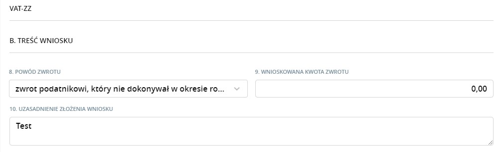 VAT-ZZ – zostaje dołączony w przypadku chęci zwrotu nadwyżki podatku naliczonego nad należnym. Różnica może zostać zwrócona na rachunek bankowy w terminie 60 dni, po podaniu powodu zwrotu, wnioskowanej kwoty oraz uzasadnienia.