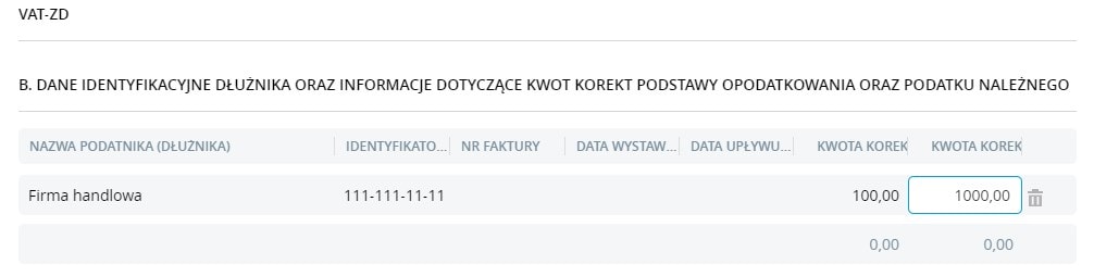 VAT-ZD – zostaje dołączony w przypadku, gdy informujemy o korekcie podstawy opodatkowania oraz kwoty podatku należnego z tytułu dostawy towarów lub świadczenia usług na terytorium kraju w przypadku wierzytelności, których nieściągalność została uprawdopodobniona (upłynął termin 150 dni od terminu płatności). Na formularzu zawiadomienia znajdują się pola dotyczące danych wierzyciela oraz danych dłużnika wraz z podaniem numeru faktury, daty jej wystawienia i upływu terminu płatności oraz kwot korekt podstawy opodatkowania i podatku należnego.