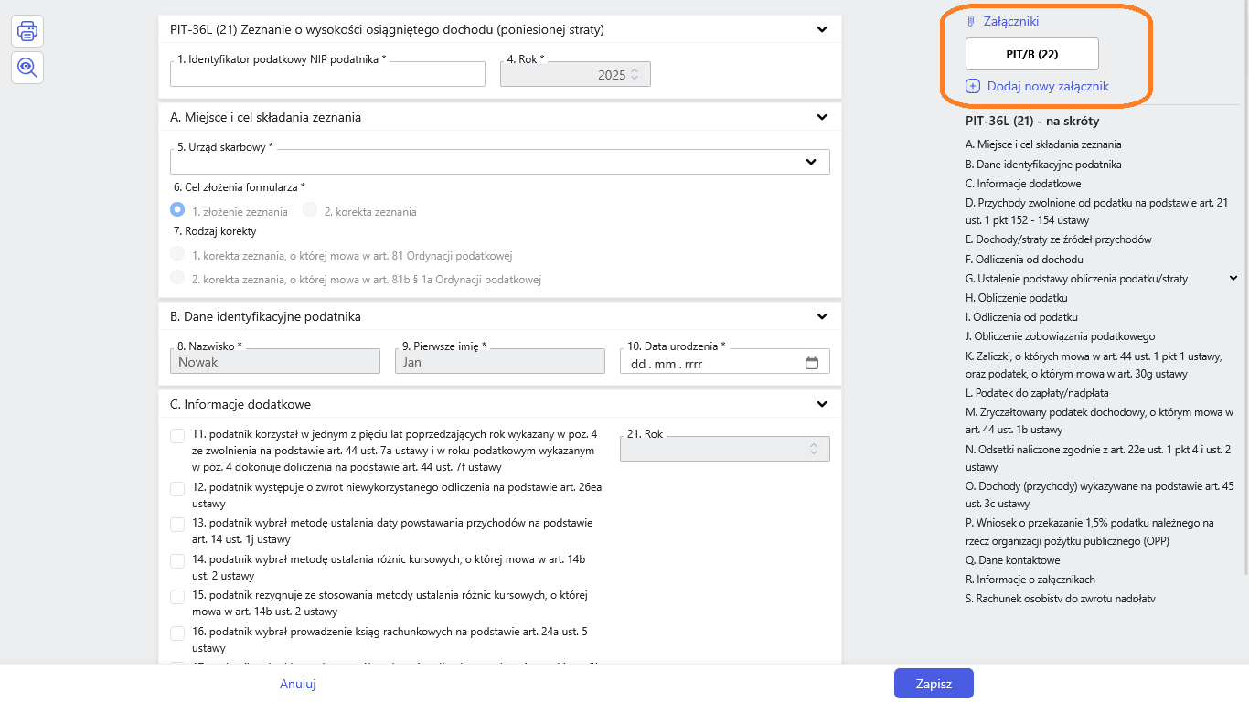 PIT/B(22) to załącznik do deklaracji PIT-36L(21) oraz PIT-36(32) zawierający informacje o wysokości dochodu (straty) z pozarolniczej działalności gospodarczej. Załącznik PIT/B jest dostępny w sekcji Załączniki na formularzu PIT-36L oraz PIT-36. Pierwszy załącznik PIT/B jest automatycznie dodawany przez program.