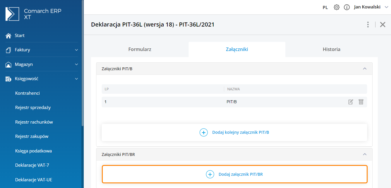 Jeśli Użytkownik doda dwa załączniki PIT/BR lub więcej, a następnie zmieni wartość pola 9 na ”tak” na pierwszym dodanym załączniku PIT/BR to program usunie z listy kolejne załączniki PIT/BR.