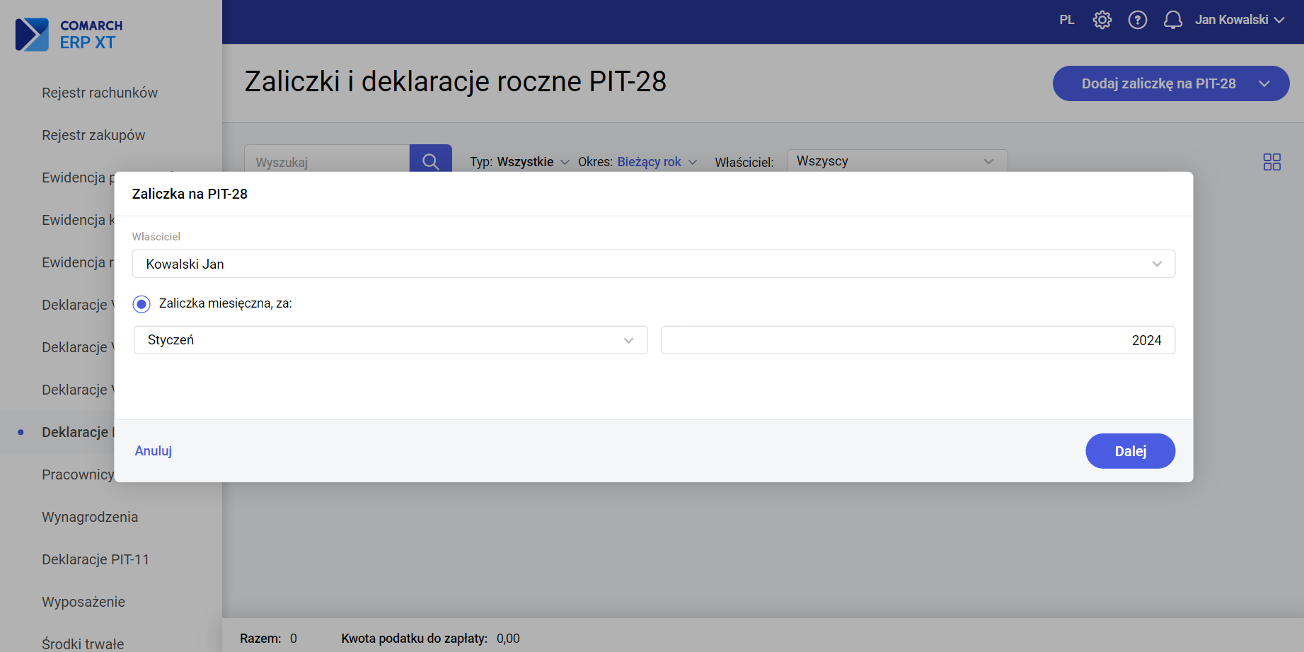 Zaliczkę na PIT-28 można również naliczyć bezpośrednio na liście Księgowość – Deklaracja PIT-28, po wybraniu przycisku „Dodaj zaliczkę na PIT-28” wybierając odpowiedniego właściciela oraz właściwy okres (miesiąc lub kwartał oraz rok).