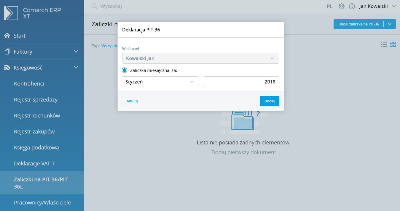 Uwaga! Opcja Nalicz zaliczkę na PIT-36 jest dostępna dla właścicieli z wybraną formą opodatkowania PIT-36 (zasady ogólne).