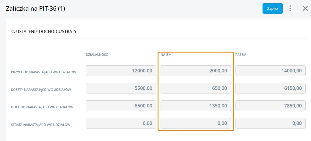 - jeżeli w Konfiguracji/ Księgowość/ Rodzaj prowadzonej działalności został wybrany Najem. Koszty i przychody z Księgi podatkowej zostaną wykazane na zaliczce na PIT-36 w sekcji Najem.