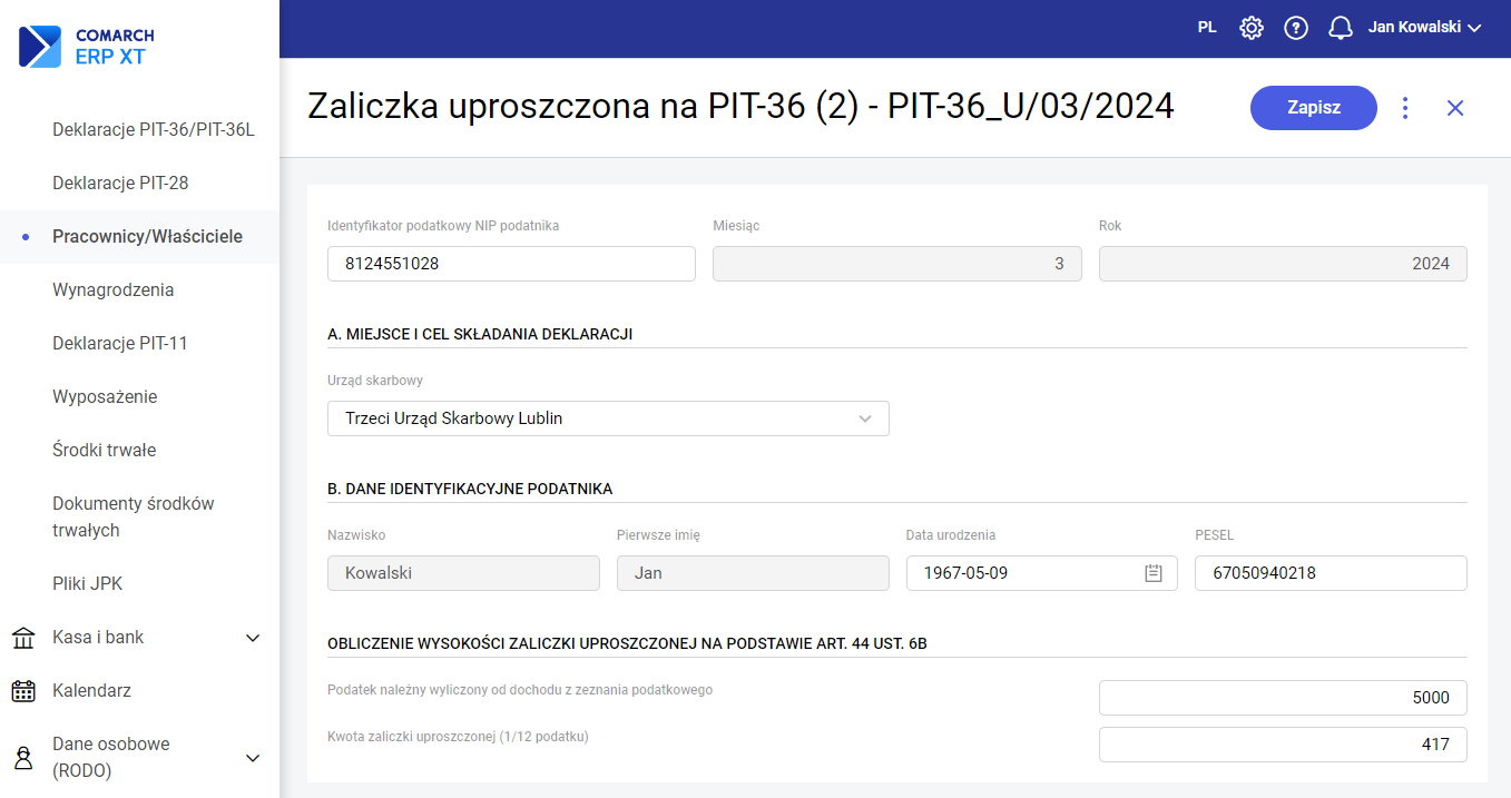 Po dodaniu właściciela z zaznaczoną opcją Zaliczki uproszczone…
