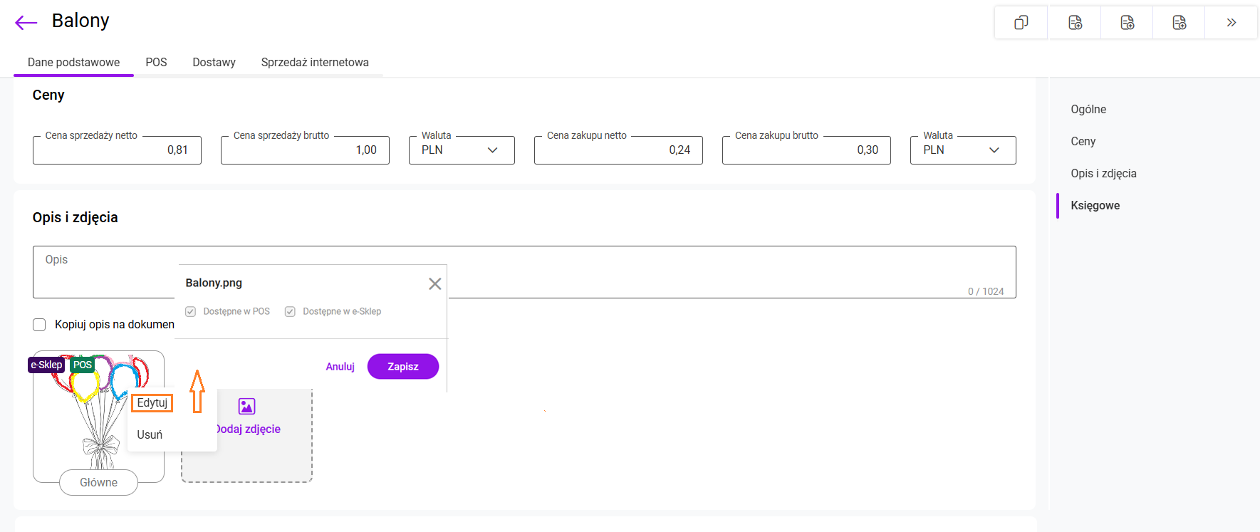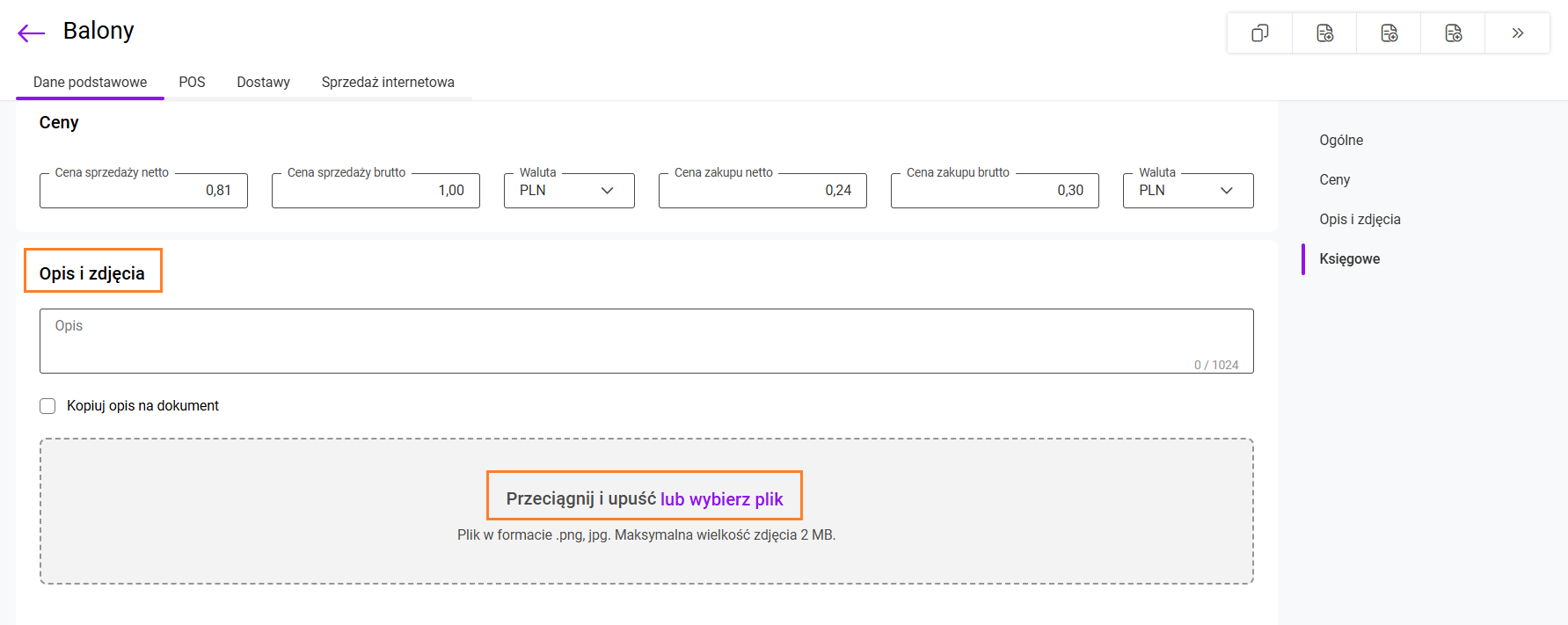 Zdjęcie do produktu można dodać na formularzu produktu na zakładce: Dane podstawowe w sekcji: Opis i zdjęcia.