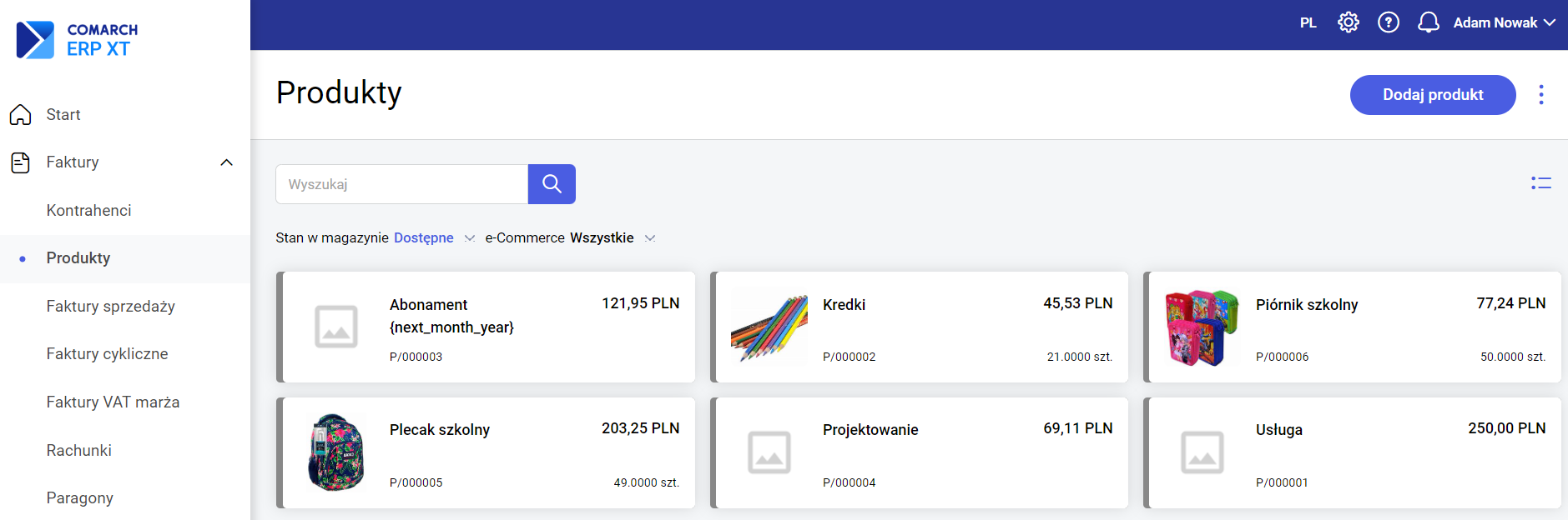 Krok pierwszy – wybieramy Faktury >> Produkty, a następnie wybieramy kartę danego produktu.