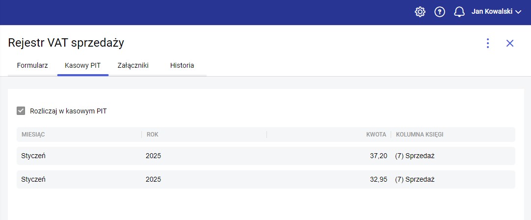 Na zakładce dostępny jest parametr Rozliczaj w kasowym PIT, służący do kwalifikowania dokumentu do rozliczania w PIT według metody kasowej, oraz tabelka pokazująca poszczególne zapłaty za dokument. Parametr Rozliczaj w kasowym PIT będzie domyślnie zaznaczony, jeżeli: Tabelka widoczna na zakładce Kasowy PIT będzie uzupełniała się automatycznie na podstawie rozliczonych zapłat. W tabelce dostępne będą wartości dotyczące: miesiąca, roku i kwoty zakwalifikowanej do rozliczenia w PIT, Kolumny księgi lub Stawki ryczałtu, do której wartość jest lub będzie zaksięgowana, oraz wysokości % kwoty księgowanej w koszty (dotyczy Rejestru zakupów i Ewidencji kosztów). Zapis księgowy w Księdze podatkowej lub Ewidencji ryczałtowej będzie powstawał pod datą rozliczenia dokumentu z zapłatą. Usunięcie rozliczenia będzie skutkowało usunięciem zapisu księgowego. Rozliczony dokument będzie można również odksięgować ręcznie, jeśli zajdzie potrzeba naniesienia na nim jakiś zmian, po czym zaksięgować ponownie .