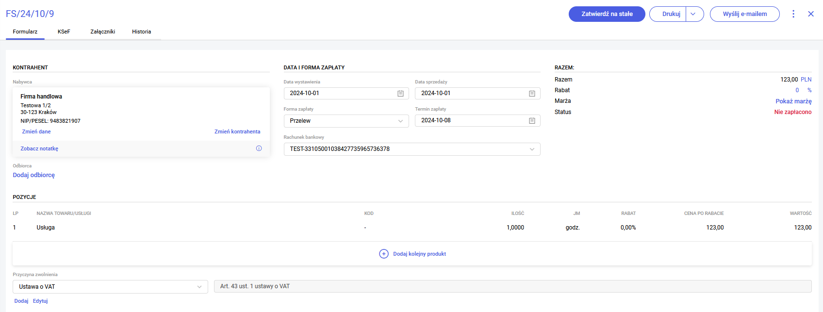 - na fakturze sprzedaży dostępne jest pole dotyczące przyczyny zwolnienia z VAT