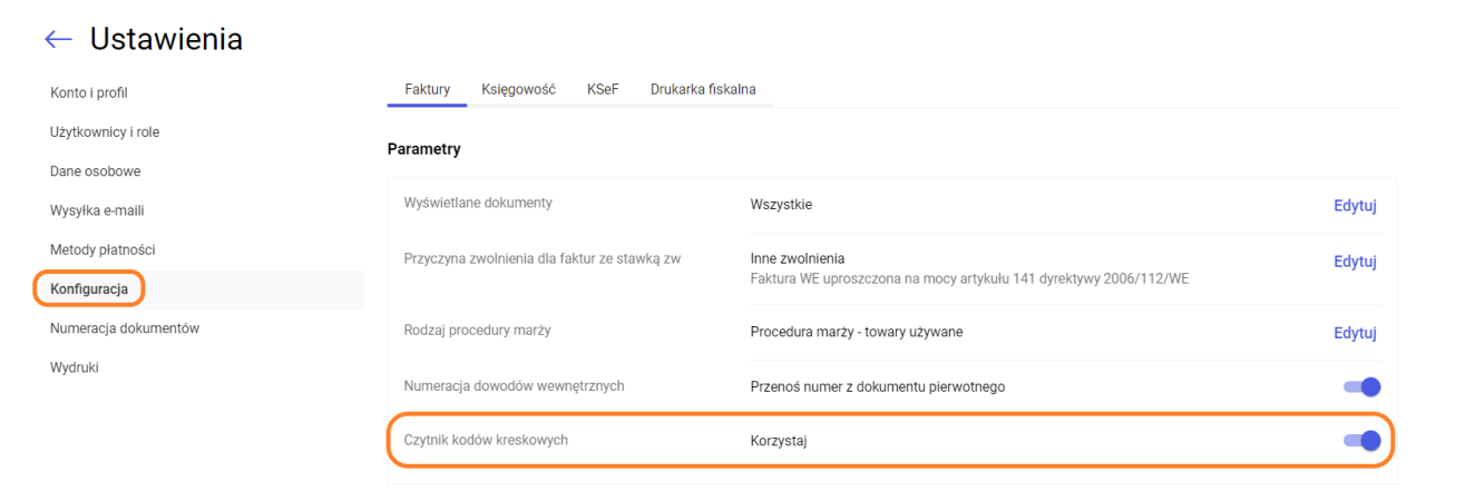 W Konfiguracji w zakładce Faktury został dodany parametr „Korzystam z czytnika kodów kreskowych”, domyślnie jest niezaznaczony. Po zaznaczeniu parametru, program przechodzi w tryb pracy z wykorzystaniem czytnika.