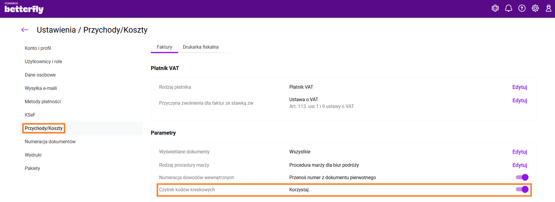 W Ustawieniach Przychody/ Koszty na zakładce Faktury znajduje się parametr: Czytnik kodów kreskowych, domyślnie jest niezaznaczony. Po zaznaczeniu parametru, program przechodzi w tryb pracy z wykorzystaniem czytnika.
