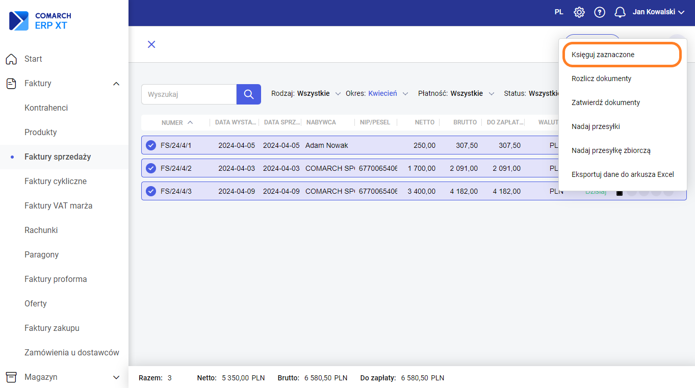 Aby seryjnie zaksięgować dokumenty z poziomu listy, należy zaznaczyć wszystkie dokumenty zatwierdzone, które chcemy zaksięgować, a następnie z menu kontekstowego należy wybrać opcję „Księguj zaznaczone”.