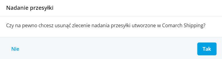 Jeśli zostanie wybrana opcja: Tak, to usuwane jest zlecenie nadania przesyłki w Comarch Shipping a w programie usuwane jest powiązanie pomiędzy dokumentem handlowym a zleceniem nadania przesyłki. Jednocześnie możliwe jest ponowne zlecenie nadania przesyłki dla wybranego dokumentu.