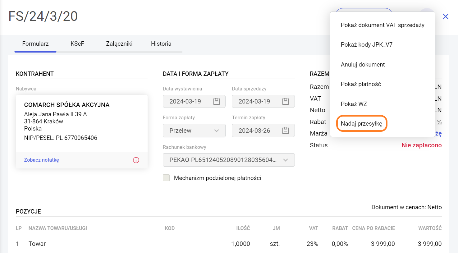 Opcja nadania przesyłki dostępna jest również z poziomu formularza dokumentu oraz w menu po zapisie dokumentu.