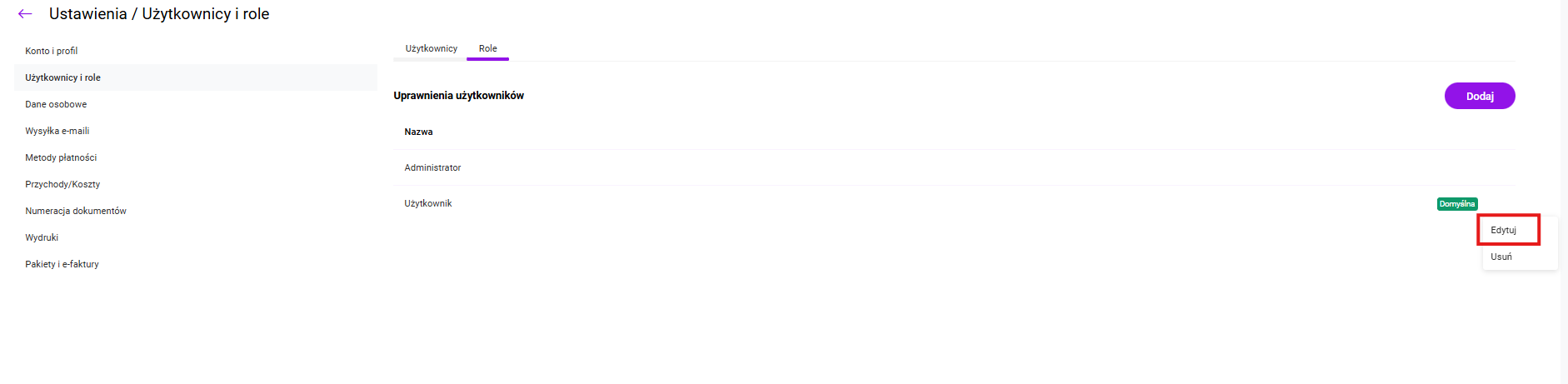 Definiowanie uprawnień odbywa się poprzez rolę, którą Administrator może przypisać użytkownikowi. Funkcja nadawania uprawnień dostępna jest w Ustawieniach / Użytkownicy i role. Zdefiniowane są domyślne role Administrator oraz Użytkownik.
