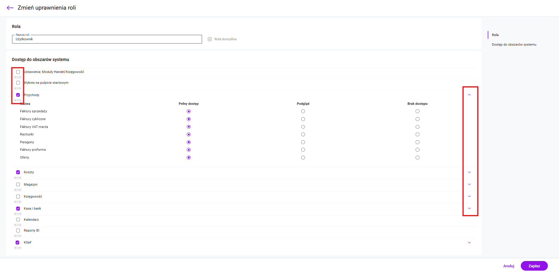 Na nowo dodawanych rolach dostęp do sekcji: Wykres na pulpicie startowym oraz Konfiguracja, jest domyślnie zablokowany. Na formularzu roli można zaznaczyć, że rola będzie ustawiana domyślnie na każdym nowo dodanym użytkowniku. Jak zdefiniować uprawnienia na roli? Z menu kontekstowego dla danej roli należy wybrać opcję Edytuj. Dostęp do sekcji można nadać zaznaczając lub odznaczając sekcję. Odznaczenie sekcji oznacza, że użytkownik nie będzie miał dostępu do całej sekcji, a więc do wszystkich dokumentów z danej sekcji. Dla każdego z dokumentów w sekcjach jest możliwość nadania 3 uprawnień: Możliwe jest przypisywanie uprawnień do sekcji: Na formularzu roli w sekcji Koszty dla Faktur zakupu, a w sekcji księgowość dla Rejestru VAT zakupu, ustawiona zostanie rola Brak dostępu. Po zalogowaniu się na konto użytkownik w menu Koszty nie będzie widział listy Faktury kosztowe i Faktury zakupu, a w menu Księgowość ukryta będzie lista Rejestr VAT zakupów.