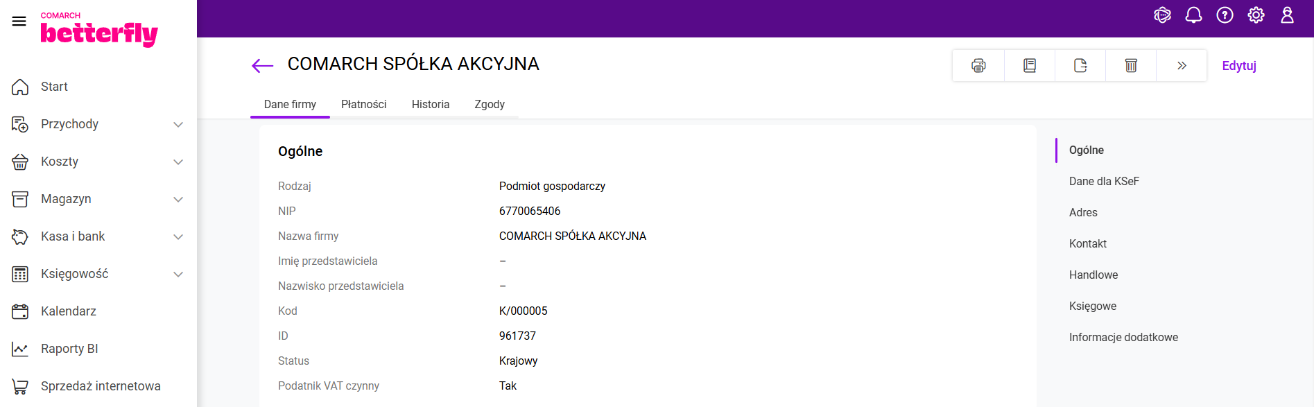 Możliwa jest również edycja kodów kontrahentów i produktów, które są już w naszej bazie. Wystarczy, że na karcie kontrahenta/produktu wpiszemy nową wartość w polu Kod (nowy kod musi być unikatowy, niewykorzystywany przez innych kontrahentów/produkty).