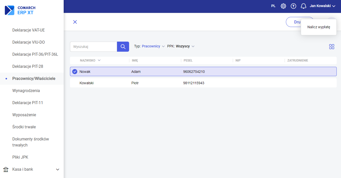 Po zaznaczeniu pracownika w Księgowość / Pracownicy/Właściciele w menu kontekstowym znajduje się opcja Nalicz wypłatę.
