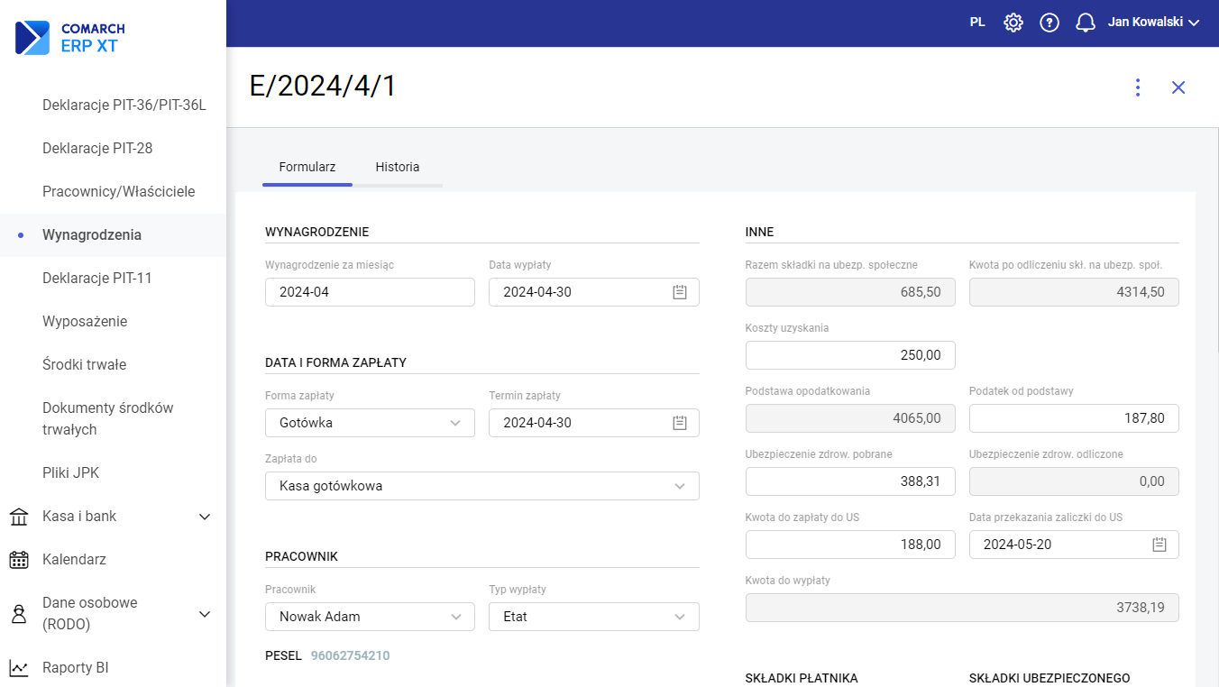 Wypłatę można naliczyć bezpośrednio na liście Księgowość / Wynagrodzenia wybierając odpowiedniego pracownika.