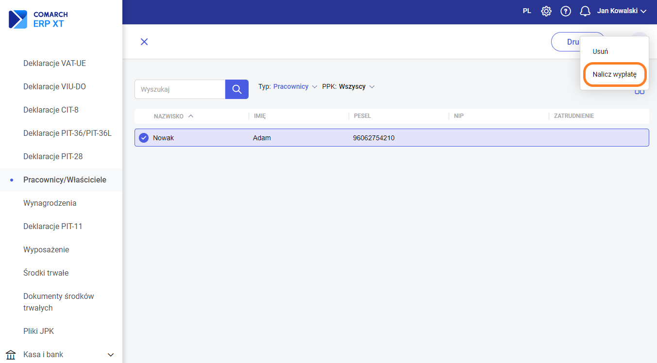 Krok pierwszy – wybieramy Księgowość >>> Pracownicy/Właściciele i zaznaczamy kartę pracownika, dla którego chcemy naliczyć wypłatę. Następnie z menu kontekstowego wybieramy opcję „Nalicz wypłatę”.