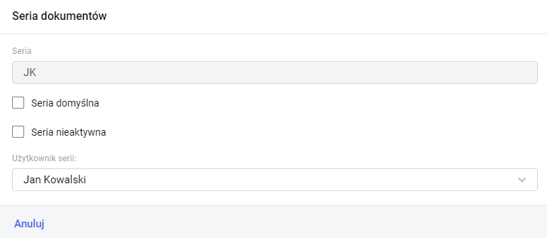 - seria przypisana do Użytkownika – będzie automatycznie proponowana na wystawianych przez niego dokumentach. Taka seria jest dostępna tylko dla danego Operatora i nie może jej użyć na swoich dokumentach nikt inny.
