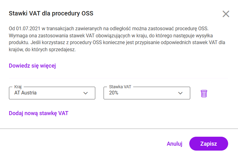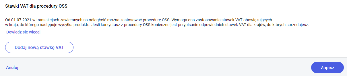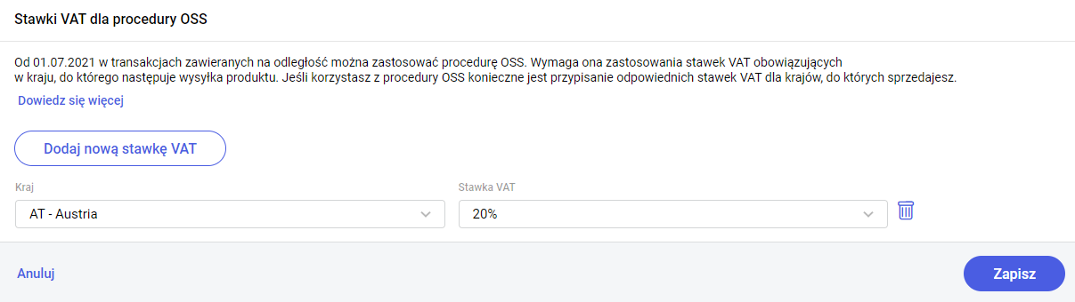 Na potrzeby ewidencjonowania dokumentów sprzedażowych w systemie procedury OSS, dla towarów i usług należy przypisać stawki VAT obowiązujące w poszczególnych Państwach Unii Europejskiej. Stawki te będą wykorzystywane na dokumentach sprzedażowych, na których zostanie zastosowany rodzaj transakcji: Procedura OSS.