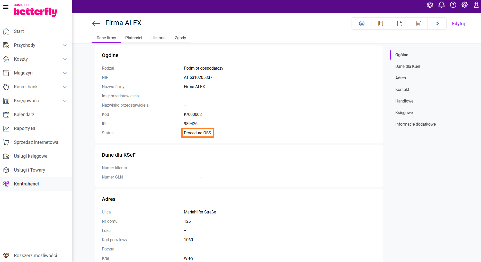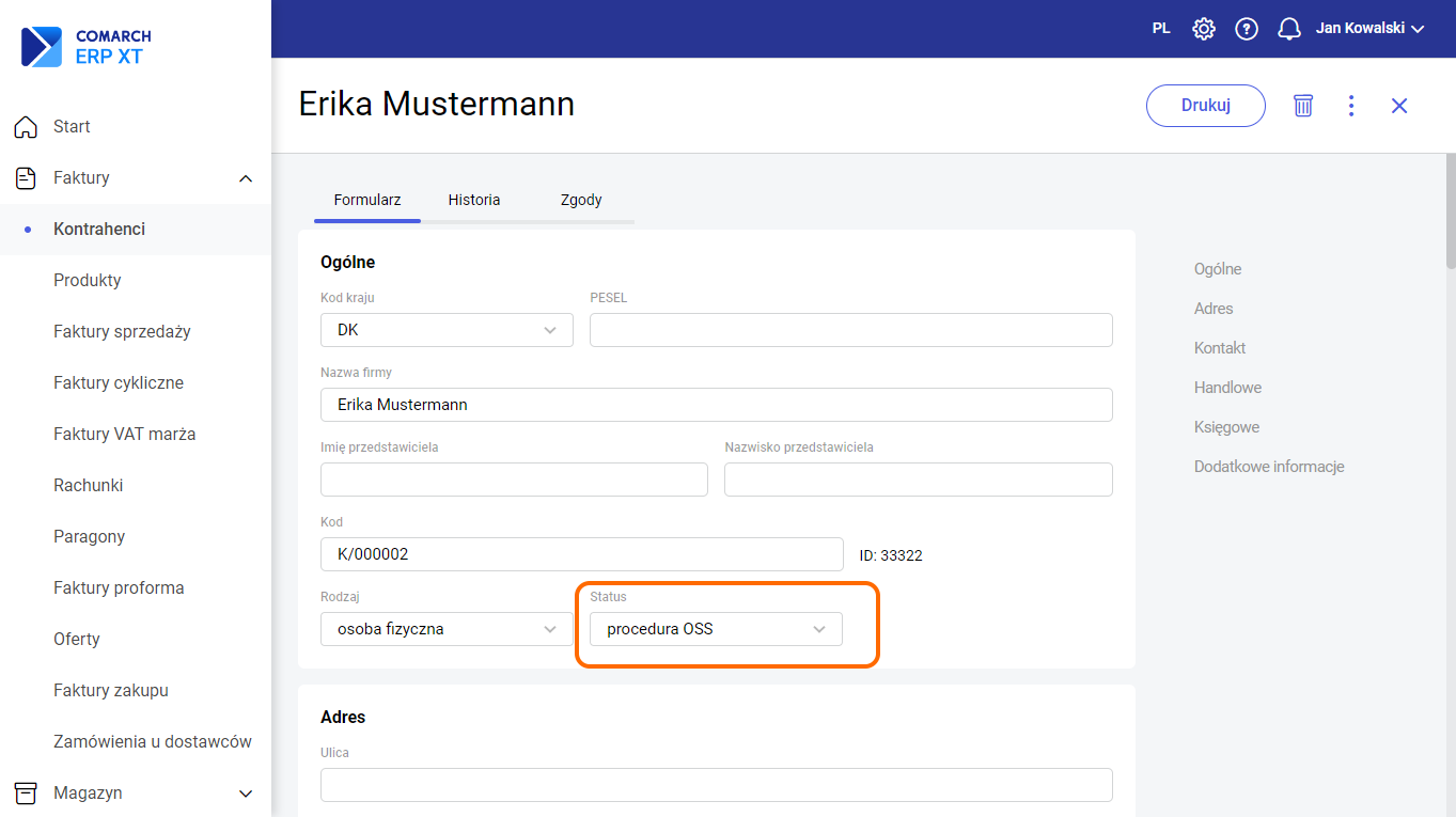Na karcie kontrahenta w polu Status dostępny jest rodzaj transakcji: procedura OSS. Ten rodzaj powinien zostać wybrany dla kontrahentów z innego kraju UE, dla których realizowana jest sprzedaż towarów na odległość. Pozwoli to na skorzystanie z uproszczonej procedury OSS w przypadku przekroczenia limitu 10 tys. EUR.