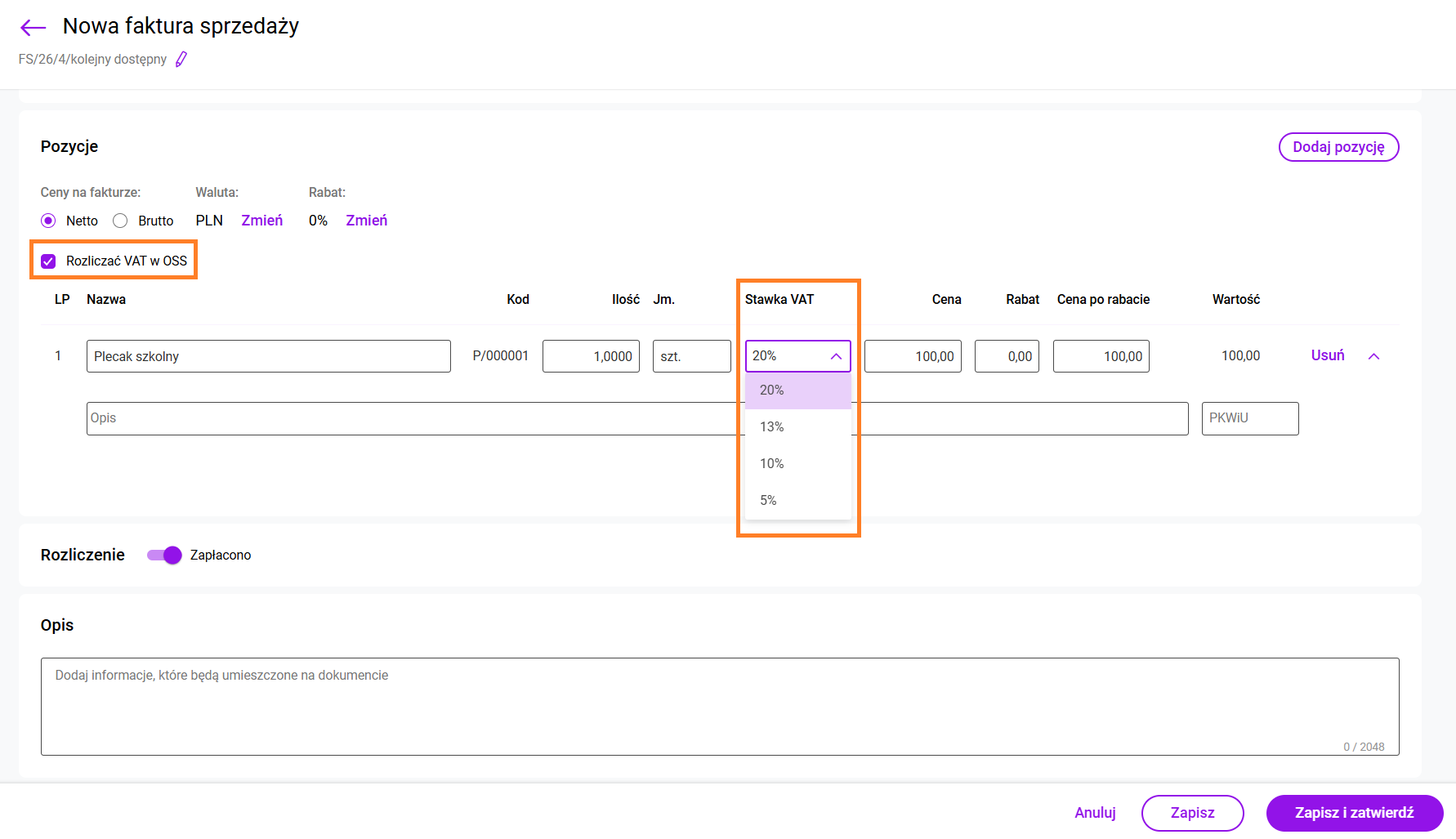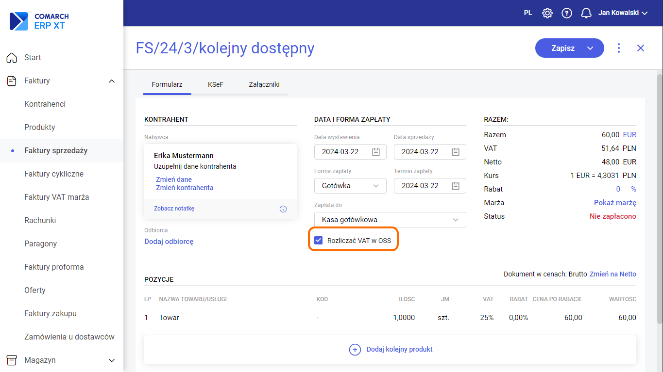 Jeżeli na dokument związany ze sprzedażą zostanie wybrany kontrahent z rodzajem transakcji Procedura OSS, to dla każdej pozycji dokumentu będzie proponowana stawka VAT z karty produktu zgodnie z krajem odbiorcy wybranego na dokumencie.