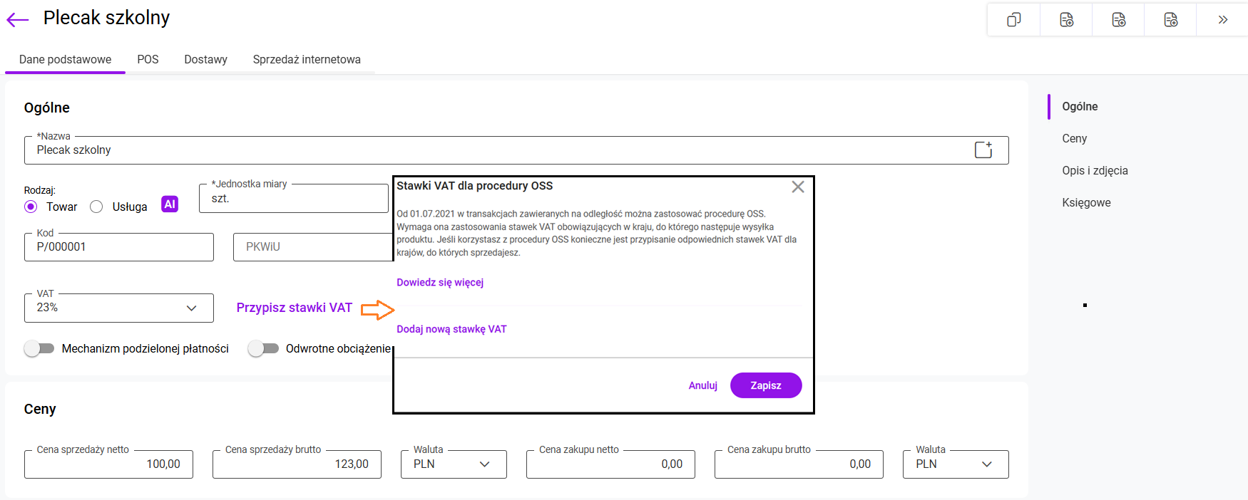 Stawki VAT na karcie produktu