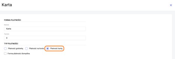 Krok drugi – na liście form płatności dodajemy nową. Na formularzu uzupełniamy nazwę oraz zaznaczamy typ „Płatność kartą”.