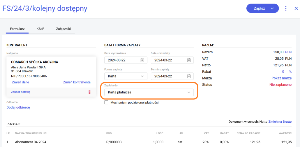 Za pomocą karty można również rozliczać płatności, a także wprowadzać zapisy kasowe/bankowe.