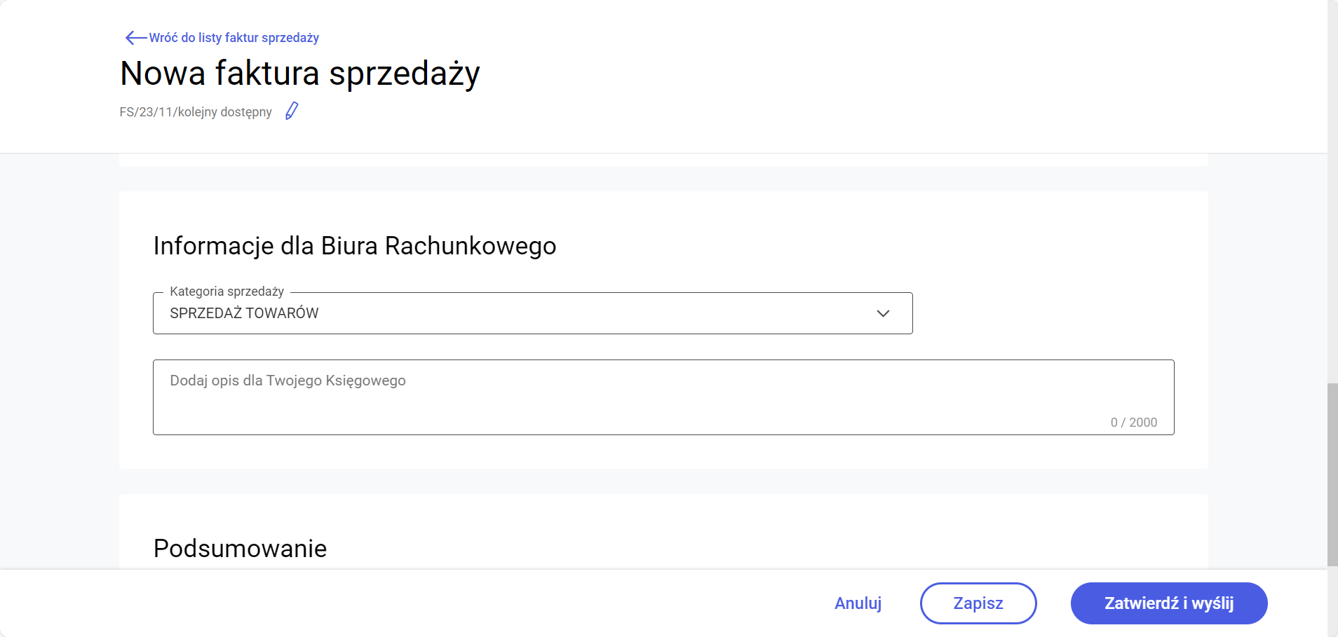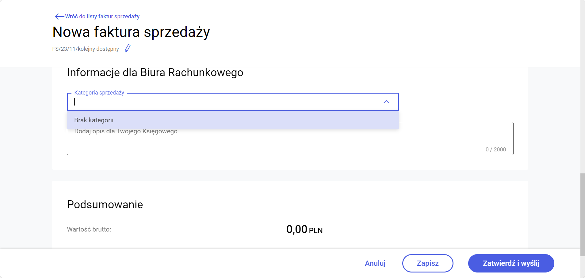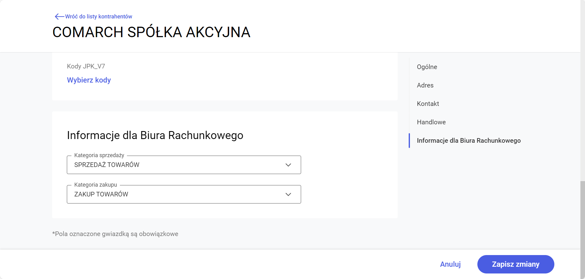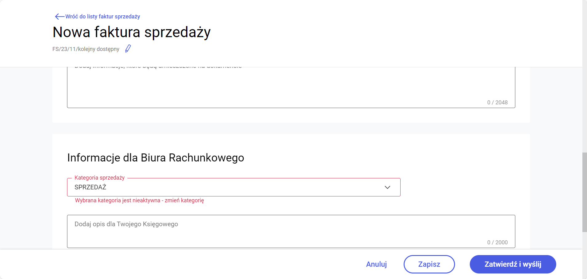 Kategorie na formularzach dokumentów są widoczne w sekcji Informacje dla Biura Rachunkowego.