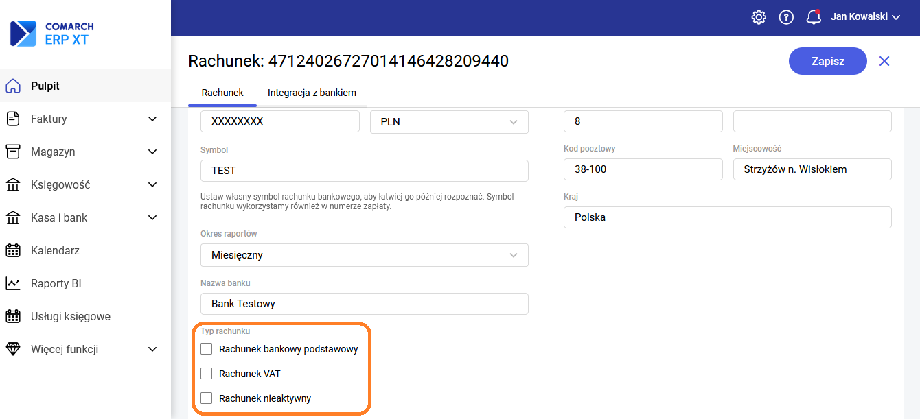 Na formularzu rachunku bankowego dodano nowy parametr: „Rachunek nieaktywny”, który można zaznaczyć, gdy dany rachunek nie jest już wykorzystywany. Domyślnie parametr jest odznaczony.