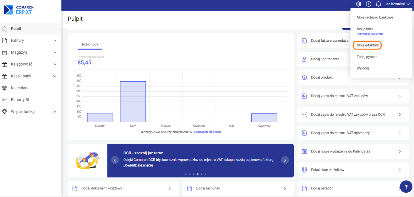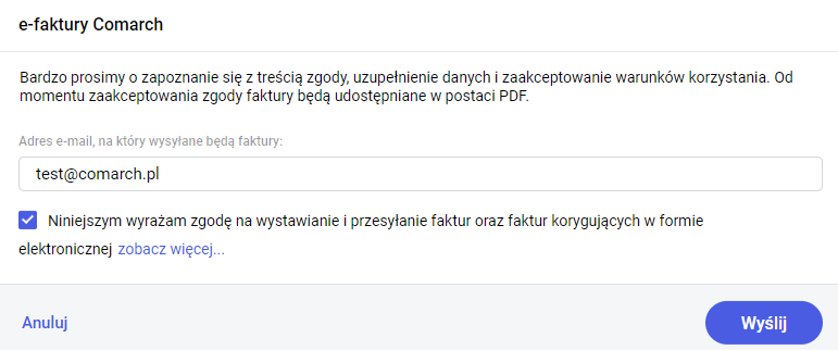 Jeśli użytkownik nie wyraził jeszcze zgody na otrzymywanie faktur drogą elektroniczną, należy kliknąć w nazwę konta w prawym górnym rogu i wybrać opcję Moje e-faktury. Otworzy się okno z możliwością zaakceptowania zgody na otrzymywanie faktur w postaci elektronicznej: Po zatwierdzeniu zgody oraz naciśnięciu kafelka Wyślij zgoda wysyłana jest do Comarch. Zgoda wymagana jest również w przypadku pierwszej płatności za pakiet za pomocą systemu Przelewy24. e-Faktury wystawione po zakupie pakietu będą wysyłane do klienta na adres mailowy konta w formie PDF oraz będą widoczne na liście dostępnej w „Nazwa użytkownika”/ Moje e-faktury.Czy ten artykuł był pomocny?