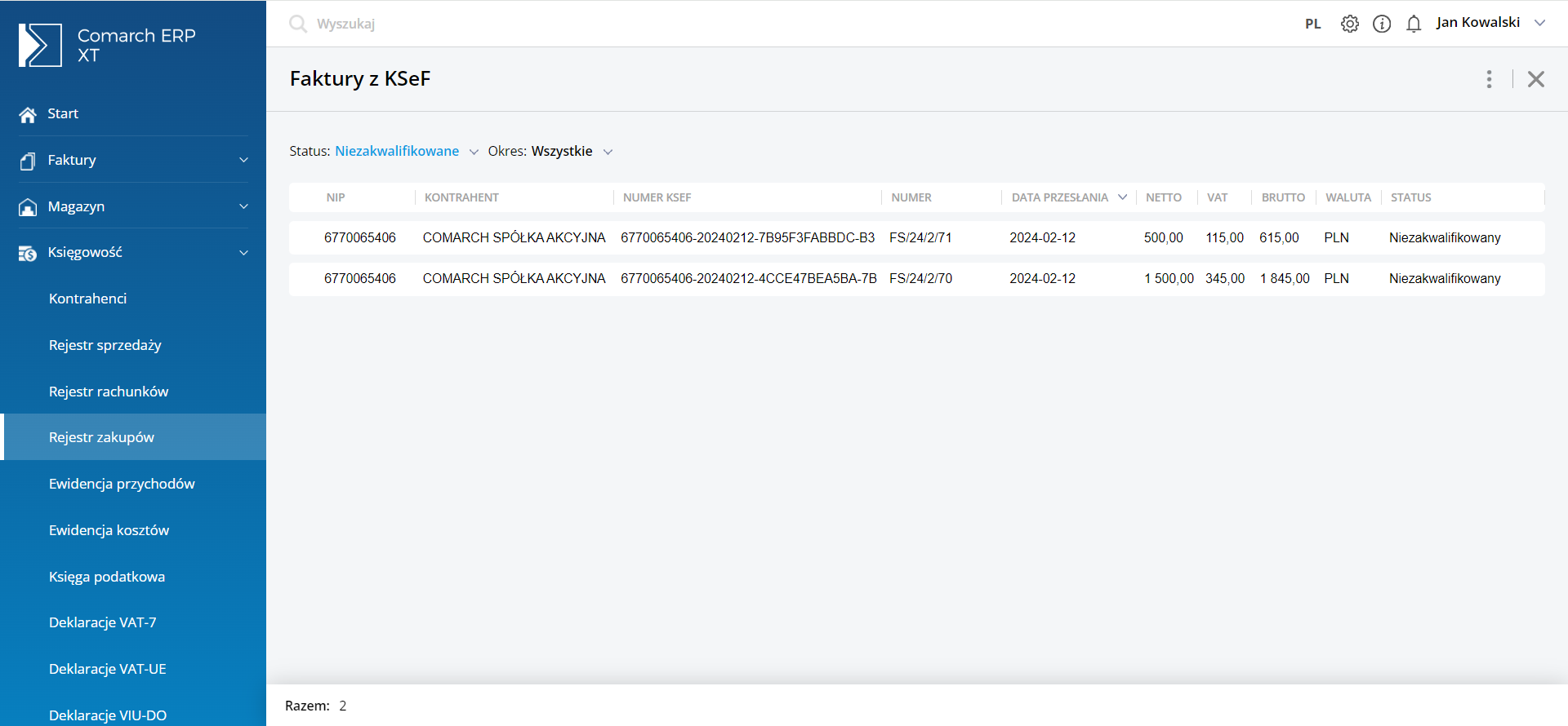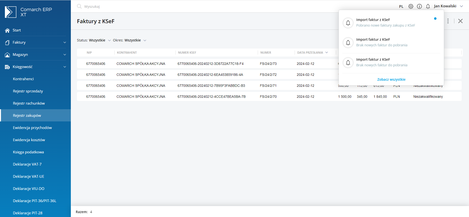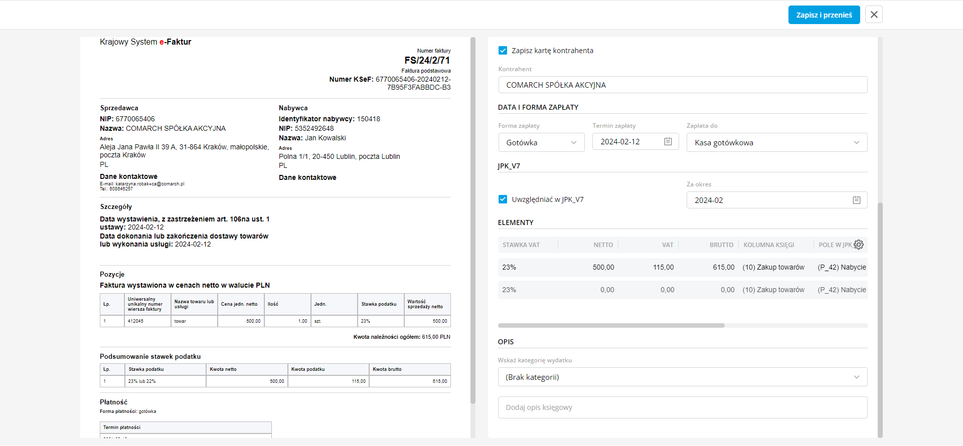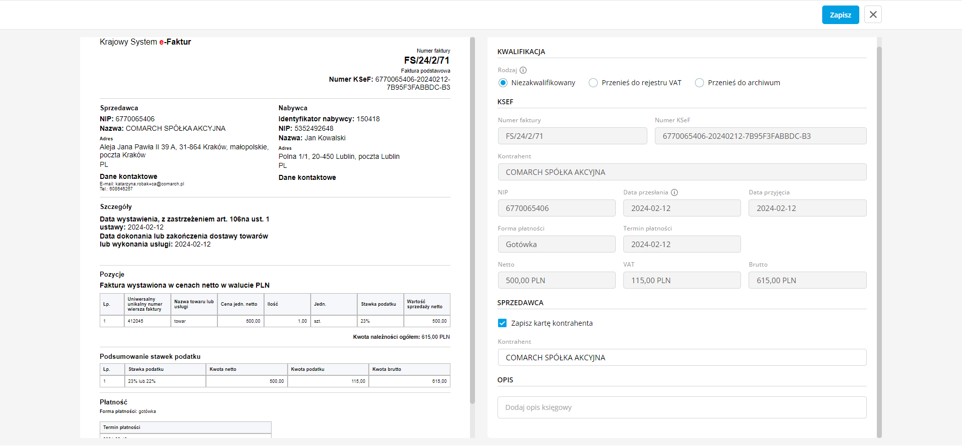 Informacje o rezultacie importu faktur są widoczne w Centrum powiadomień. Jeżeli pobrano nowe faktury Użytkownik z poziomu komunikatu wyświetlanego w Centrum powiadomień może przejść na listę Faktury z KSeF odfiltrowaną do faktur niezakwalifikowanych. Na liście Faktury z KSeF dostępne są następujące kolumny: Z poziomu listy dostępne są dwa rodzaje filtrów: Okres – domyślnie filtr przyjmuje wartość Wszystkie. Okres można zawęzić do konkretnego zakresu dat. Podgląd dokumentu pobranego z KSeF Użytkownik ma możliwość podglądu dokumentu pobranego z KSeF z poziomu: Na formularzu wyświetlane są następujące sekcje: Kwalifikacja – w programie Comarch Betterfly zdefiniowano 3 kwalifikacje jakimi można opisać dokumenty z KSeF: KSeF – znajdują się tutaj dane odczytane z dokumentu pobranego z KSeF. Dane nie są możliwe do edycji. Sprzedawca – sekcja jest dostępna, gdy nie uda się zidentyfikować kontrahenta o numerze NIP podanym na fakturze z KSeF. Wtedy automatycznie zaznaczana jest opcja Zapisz kartę kontrahenta, a po zapisaniu dokumentu zostanie założona nowa karta kontrahenta. Data i forma zapłaty – Użytkownik może zmienić termin i formę zapłaty, które zostaną przeniesione na dokument w rejestrze VAT oraz płatność. Jeżeli kontrahent został zidentyfikowany a rodzaj formy płatności pobranej z KSeF jest zgodny z rodzajem na karcie kontrahenta to forma płatności zostanie przeniesiona z karty kontrahenta. W przeciwnym wypadku forma zapłaty w sekcji Data i forma zapłaty zostanie uzupełniona zgodnie z poniższym: W sytuacji gdy pole forma płatności w sekcji KSeF jest puste forma zapłaty w sekcji Data i forma zapłaty zostanie uzupełniona jak poniżej: W przypadku gdy w sekcji KSeF pole Termin płatności nie jest uzupełnione, w polu Termin zapłaty podpowie się data liczona zgodnie z datą przesłania oraz formą zapłaty. JPK_V7 – w przypadku gdy weryfikacja statusu podatnika będzie negatywna lub nie uda się sprawdzić statusu parametr Uwzględniać w JPK_V7 zostanie odznaczony. Waluta – sekcja jest widoczna, gdy wybrana jest kwalifikacja Przenieś do rejestru VAT oraz waluta na pobranej fakturze z KSeF jest inna niż PLN. Elementy – znajdują się tutaj dane przeniesione z dokumentu pobranego z KSeF. Użytkownik ma możliwość modyfikacji danych w tej sekcji. Opis/ Informacje dla Biura rachunkowego – sekcja przyjmuje nazwę Opis, gdy wybrana jest kwalifikacja inna niż Przenieś do rejestru VAT. Natomiast przy wyborze kwalifikacji Przenieś do rejestru VAT sekcja może przyjmować nazwę Opis lub Informacje dla Biura rachunkowego zgodnie z poniższym: Przenoszenie faktur pobranych z KSeF do rejestru VAT Faktury pobrane z KSeF można przenieść do rejestru VAT z poziomu formularza dokumentu z KSeF. W sekcji Kwalifikacja należy wybrać opcję Przenieś do rejestru VAT, a następnie nacisnąć przycisk Zapisz i przenieś. Po przeniesieniu dokumentu do rejestru VAT formularz dokumentu pobranego z KSeF jest widoczny w trybie tylko do odczytu. Z poziomu formularza dokumentu pobranego z KSeF można przejść do zapisu w rejestrze VAT za pomocą przycisku Zobacz dokument w rejestrze VAT. Na dokumencie dodanym w rejestrze VAT, a pobranym z KSeF: W przypadku pracy w środowisku demo na liście faktur pobranych z KSeF widoczna jest informacja: Faktury z KSeF – serwer DEMO. Faktury pobrane ze środowiska Demo można jedynie zarchiwizować – nie można ich przenieść do rejestru VAT. Zobacz także: Jak skonfigurować integrację z Krajowym Systemem e-Faktur (KSeF)? Jak wysłać fakturę do Krajowego Systemu e-Faktur (KSeF)? Integracja Comarch Betterfly z Krajowym Systemem e-Faktur (KSeF)