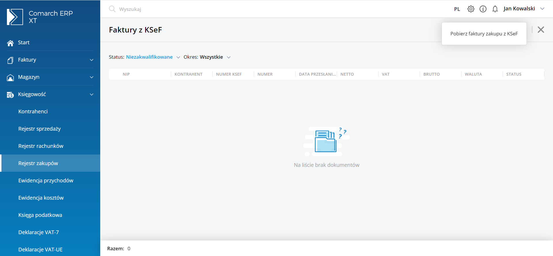 Po przejściu na listę Faktury z KSeF Użytkownik ma możliwość pobrania faktur z KSeF za wybrany okres za pomocą opcji Pobierz faktury zakupu z KSeF.