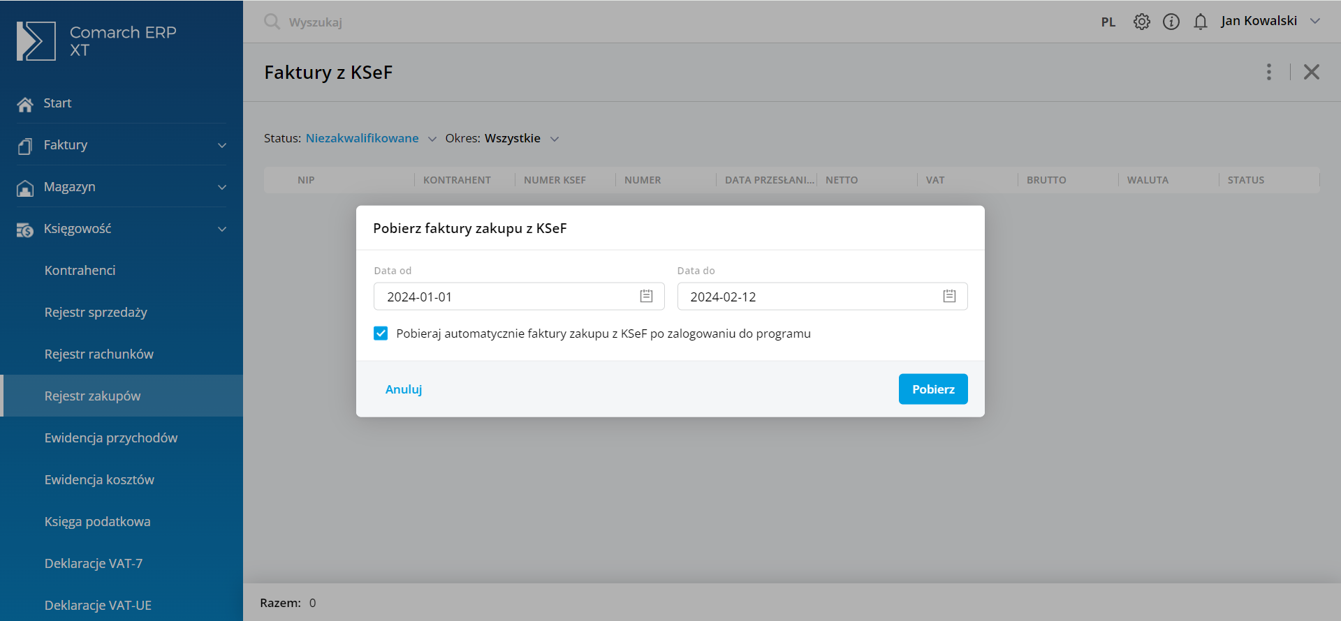 Po wybraniu opcji Pobierz faktury zakupu z KSeF należy wskazać, za jaki okres faktury mają zostać pobrane. Po naciśnięciu przycisku Pobierz dokumenty są przenoszone na listę Faktury z KSeF. Jeżeli dokument został już wcześniej zaimportowany to przy kolejnym pobieraniu nie zostanie dodany ponownie.