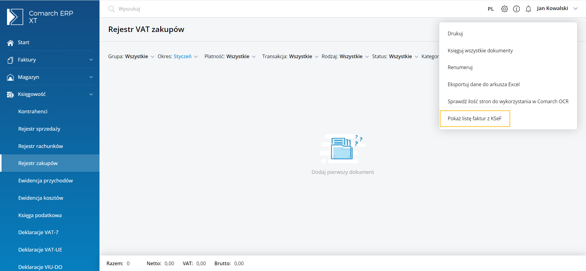Lista Faktury z KSeF jest wywoływana z poziomu listy faktur zakupu w Rejestrze zakupów za pomocą opcji Pokaż listę faktur z KSeF znajdującej się w menu kontekstowym.