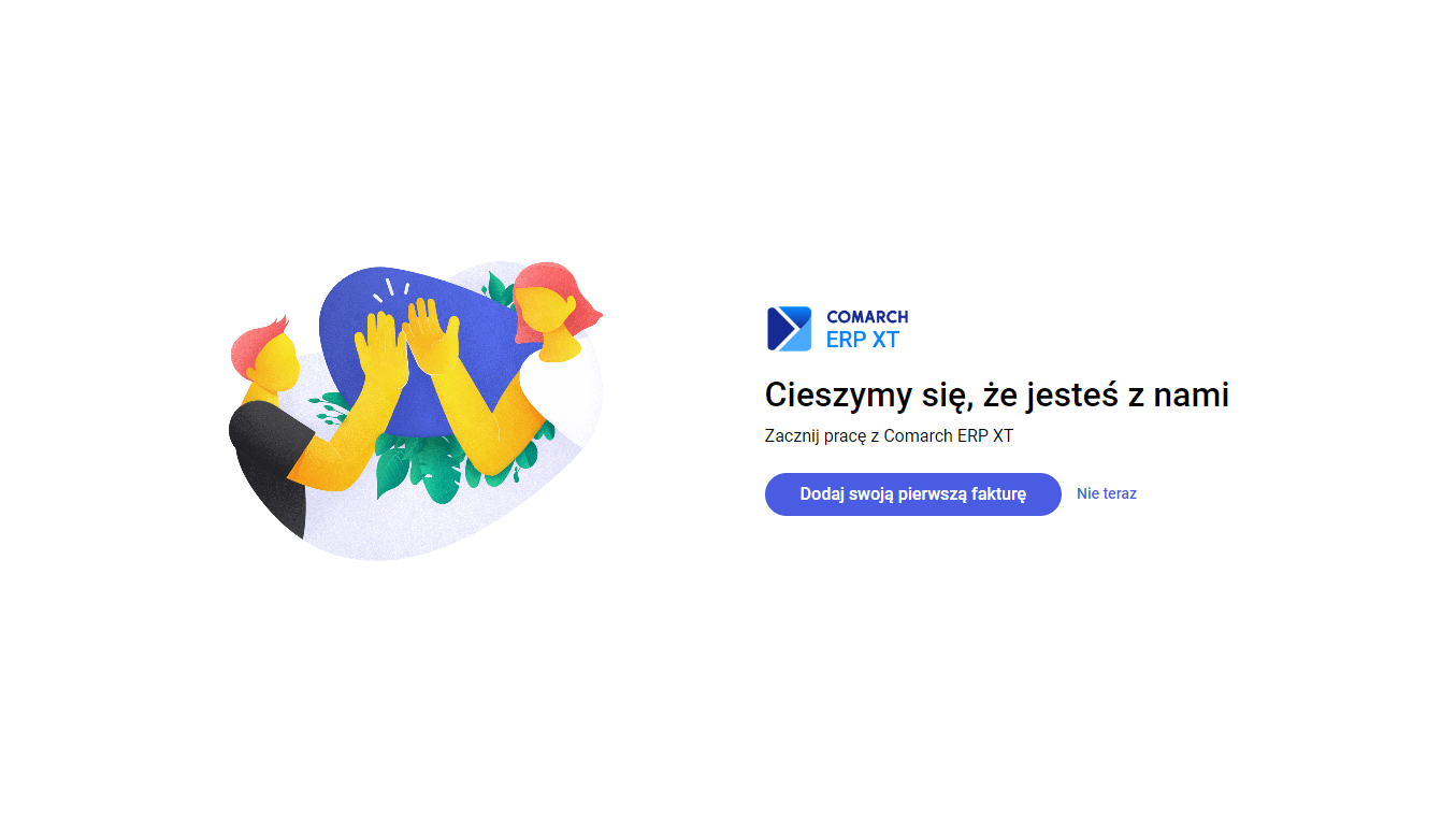 Program loguje nas na konto. Po zalogowaniu pojawia się wiadomość powitalna. Aby od razu dodać fakturę należy kliknąć przycisk Dodaj swoją pierwszą fakturę, natomiast wybierając Nie teraz program przeniesie nas na ekran startowy.