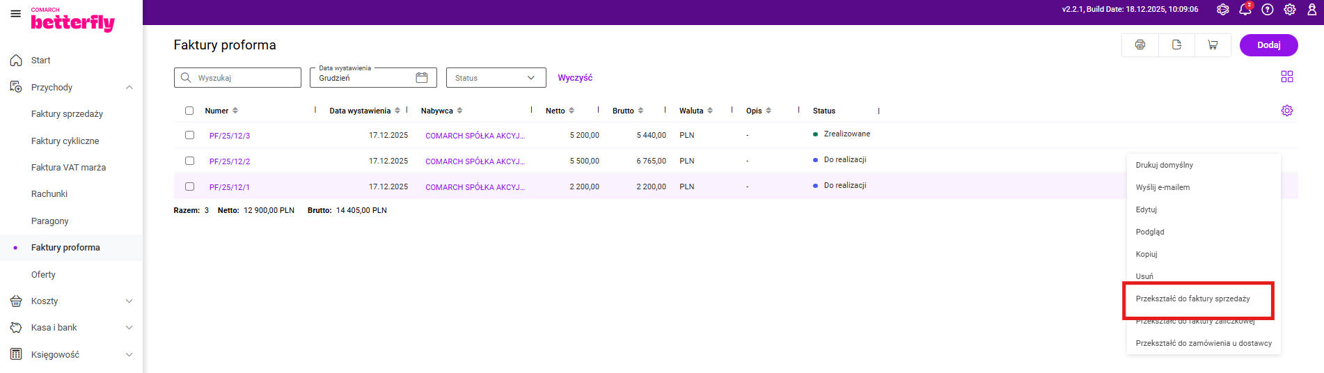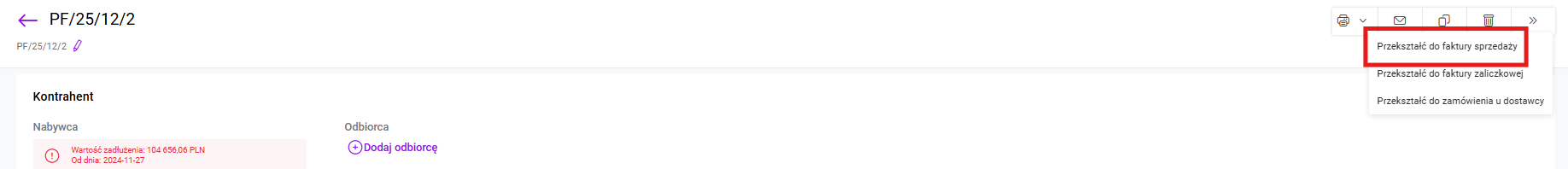 Krok drugi – wybieramy z menu kontekstowego lub z formularza opcję „Przekształć do faktury sprzedaży”.