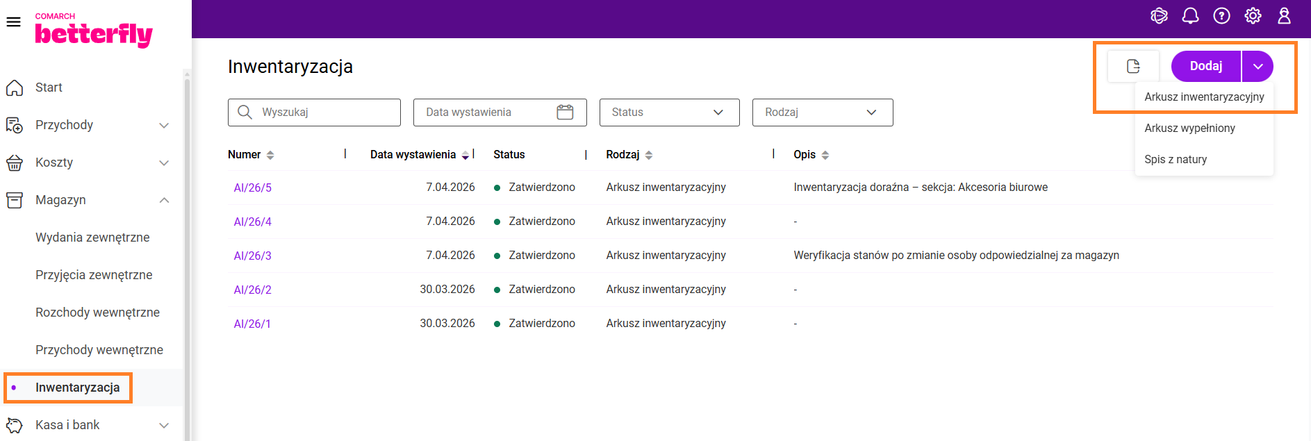 Możliwość inwentaryzacji jest dostępna w pakiecie Magazyn. Pierwsza opcja to dodanie pustego arkusza inwentaryzacyjnego, w którym jest możliwość ręcznego uzupełniania stanu towarów. Druga opcja to dodanie arkusza wypełnionego przez program.