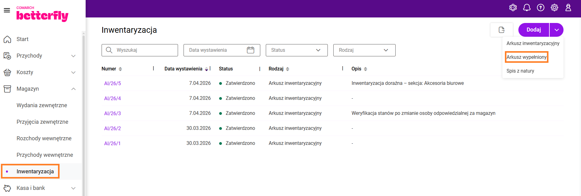 W menu Magazyn wybrać Inwentaryzacja/ Dodaj i po rozwinięciu strzałki wybrać: Arkusz wypełniony.